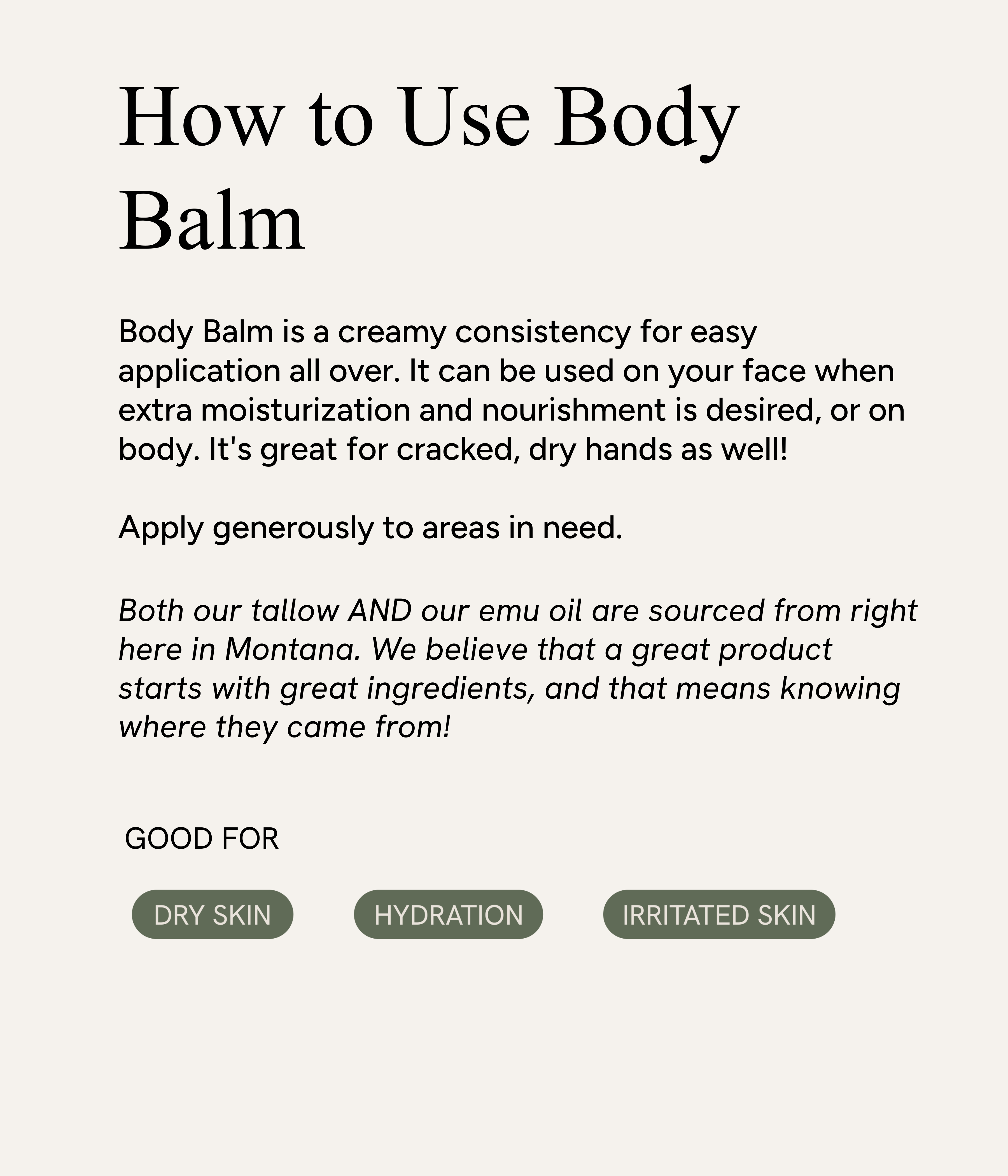 Unit price perBody Balm provides deep absorbing hydration, and locks in moisture, without the greasy residue, restoring even the most abused skin. Born and tested in the wind swept wilds of the Montana high desert, Body Balm is an essential companion.