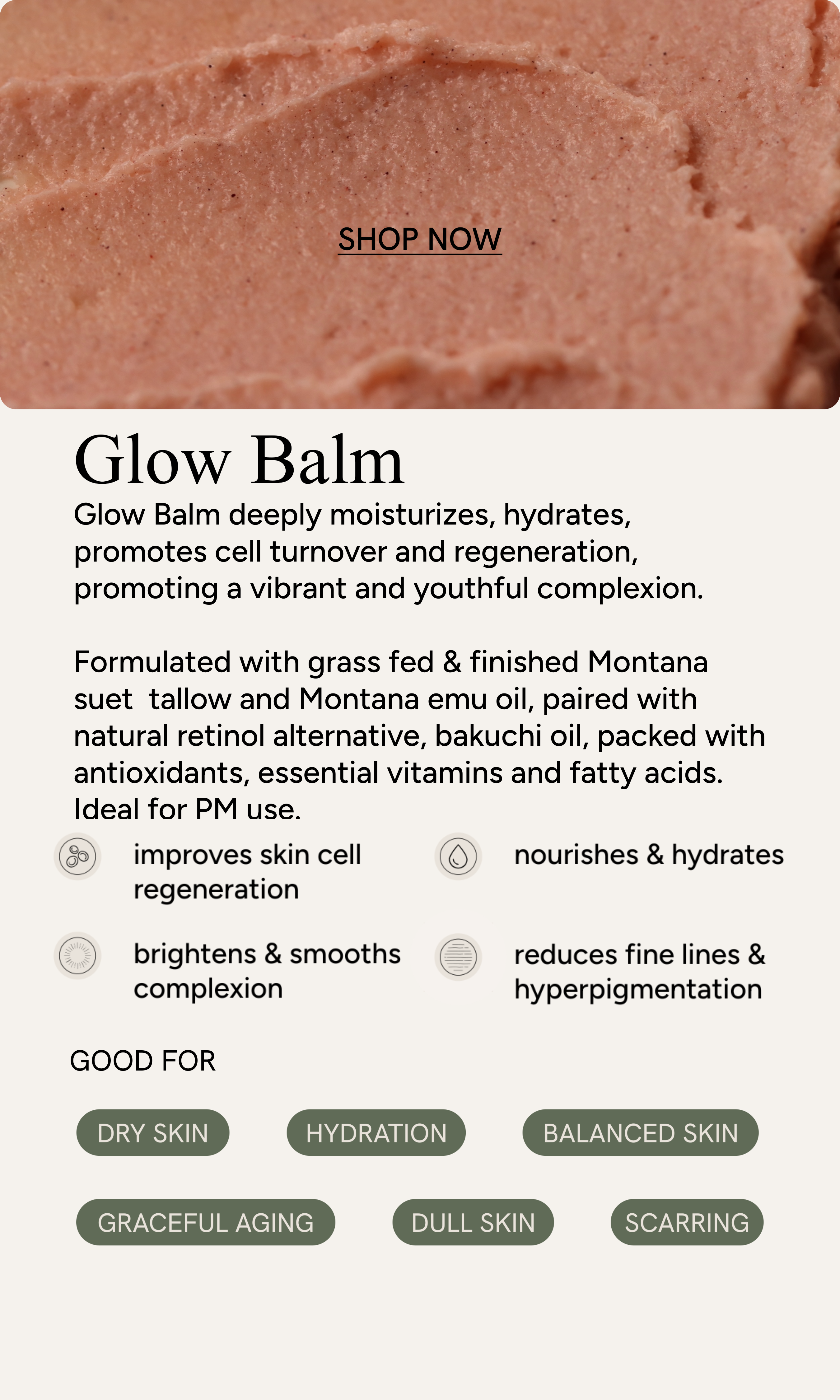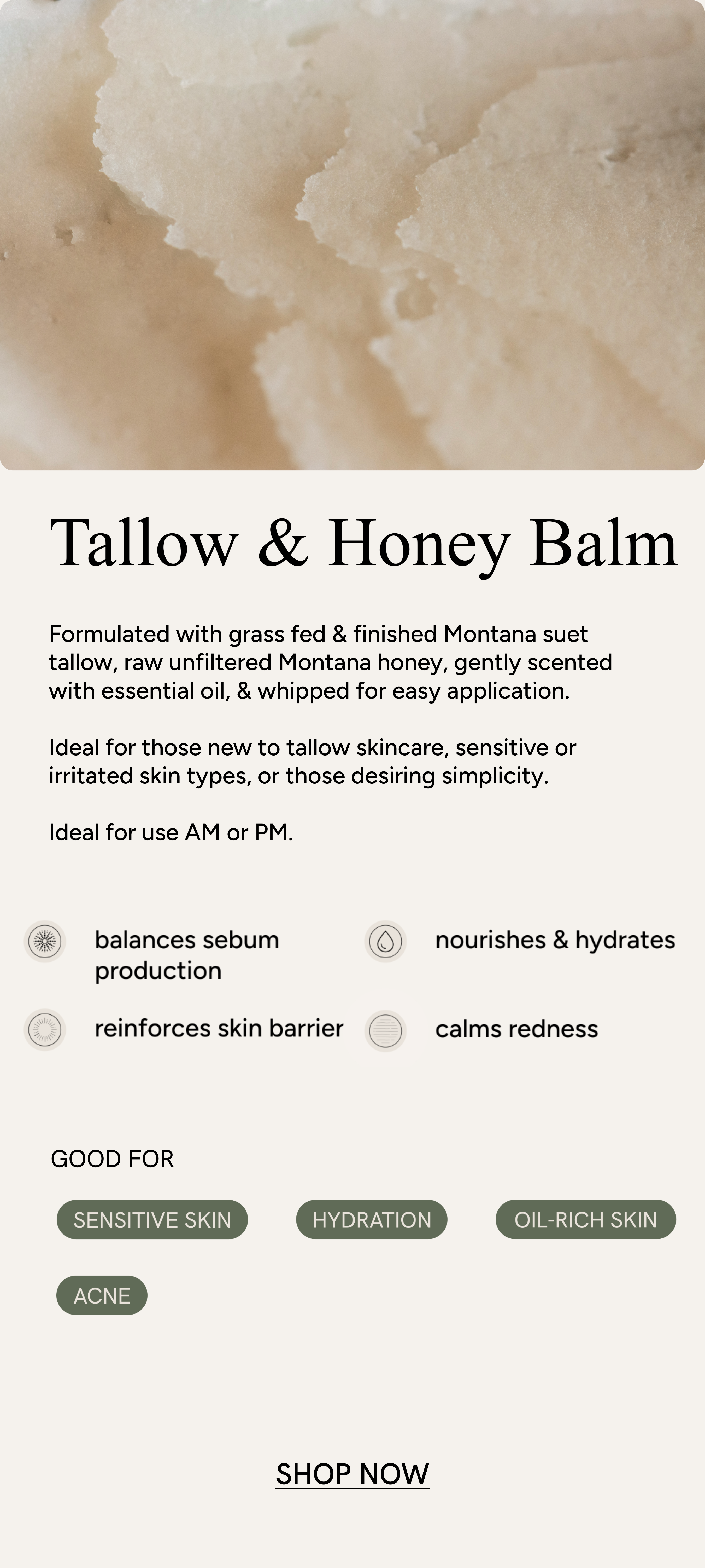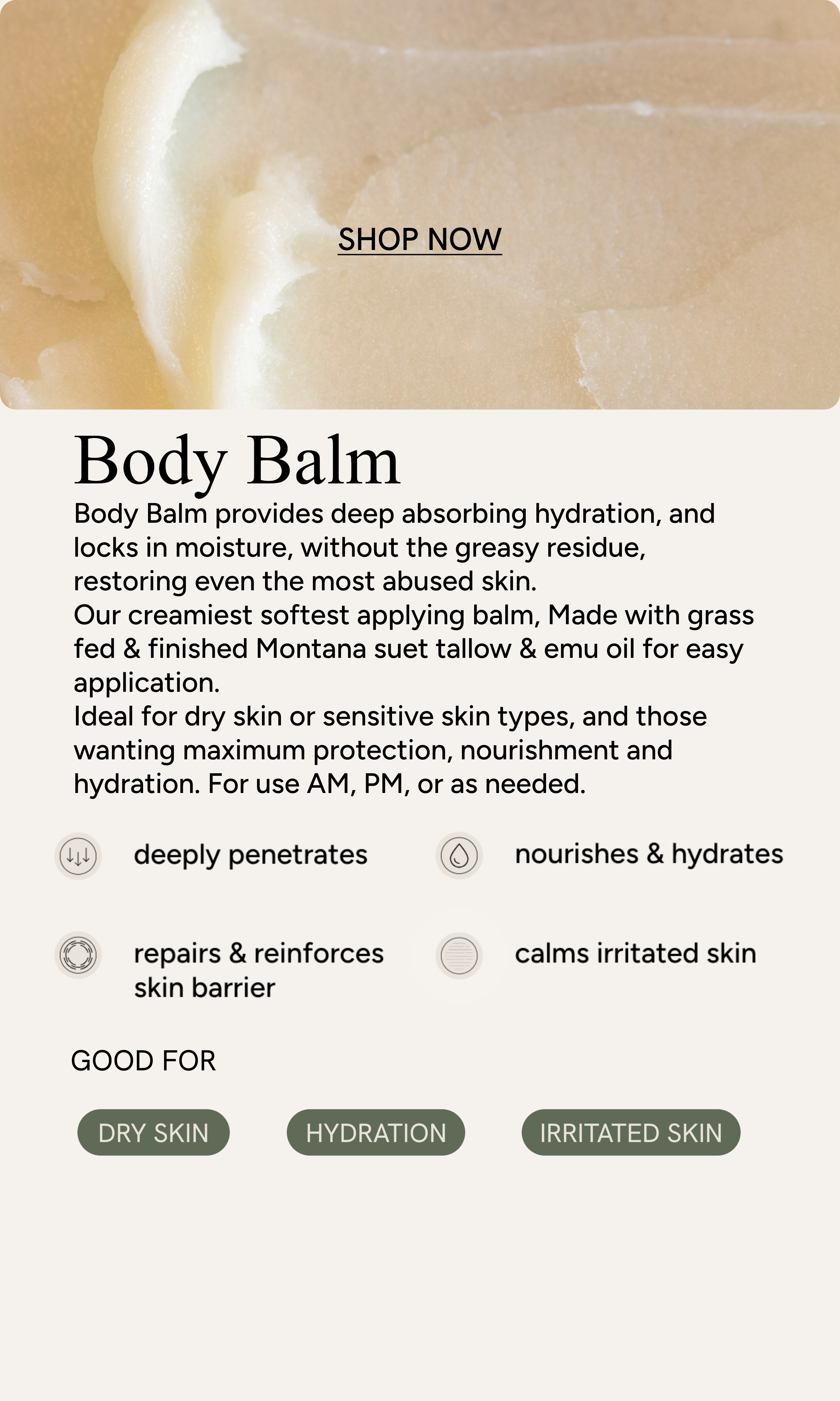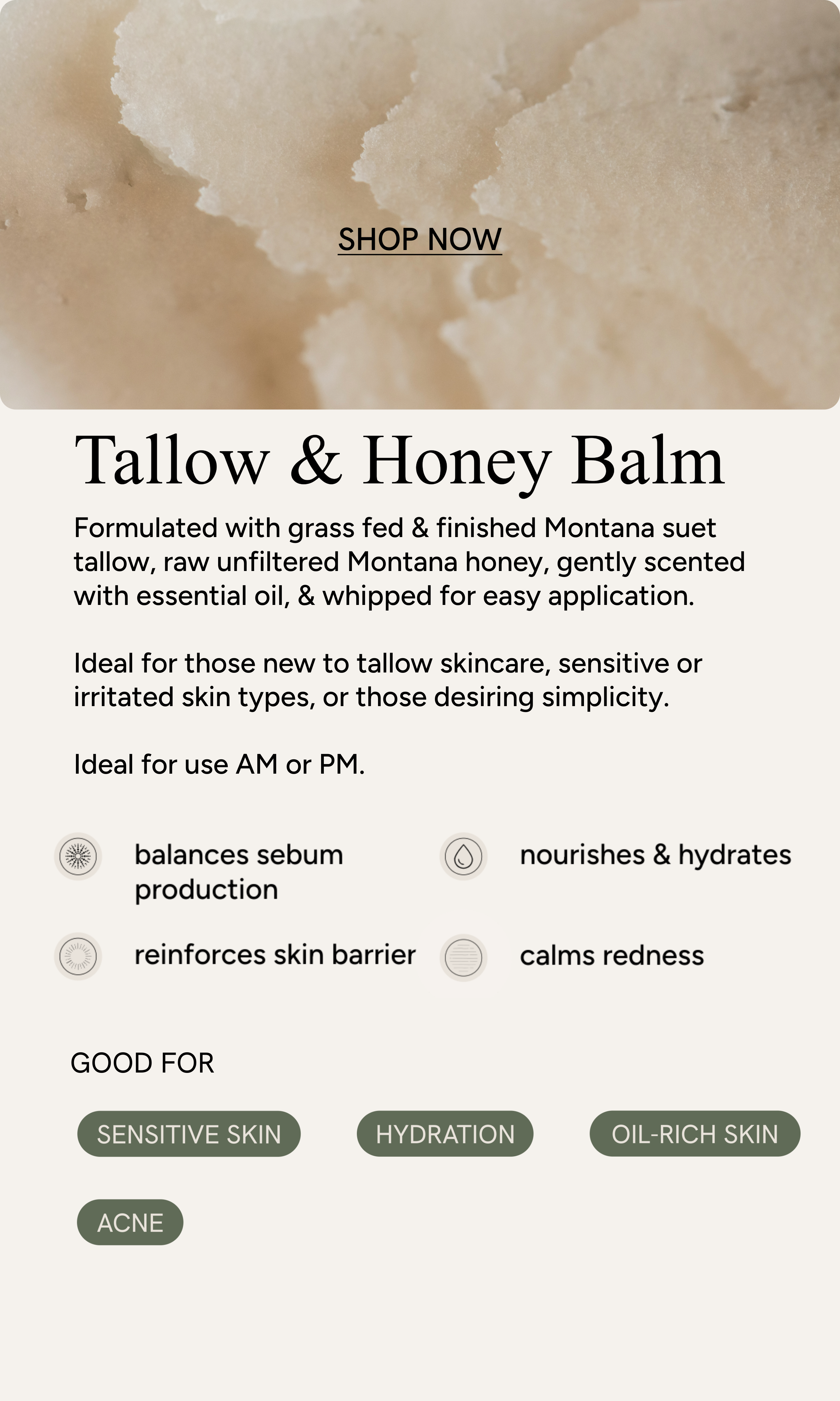 Our Base: Regeneratively raised, Grass fed & finished suet tallow from Montana cattle, chosen for it's compatibility with human skin; containing the building blocks skin can recognize and use.
