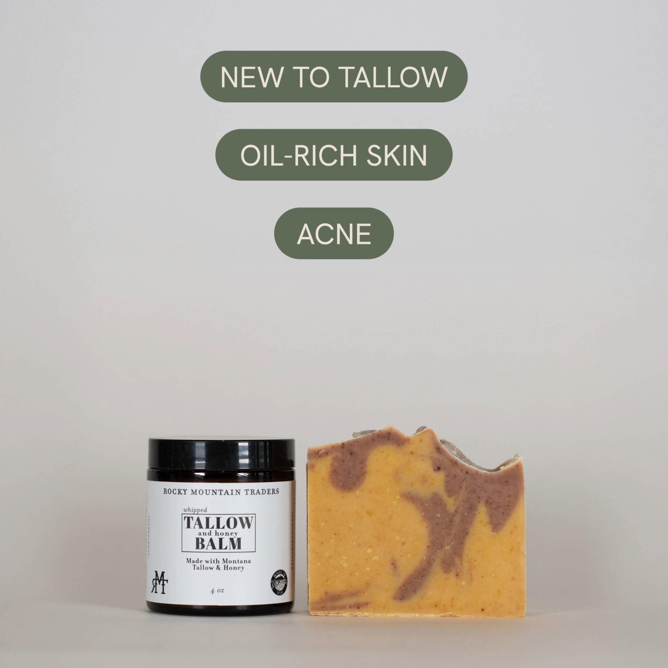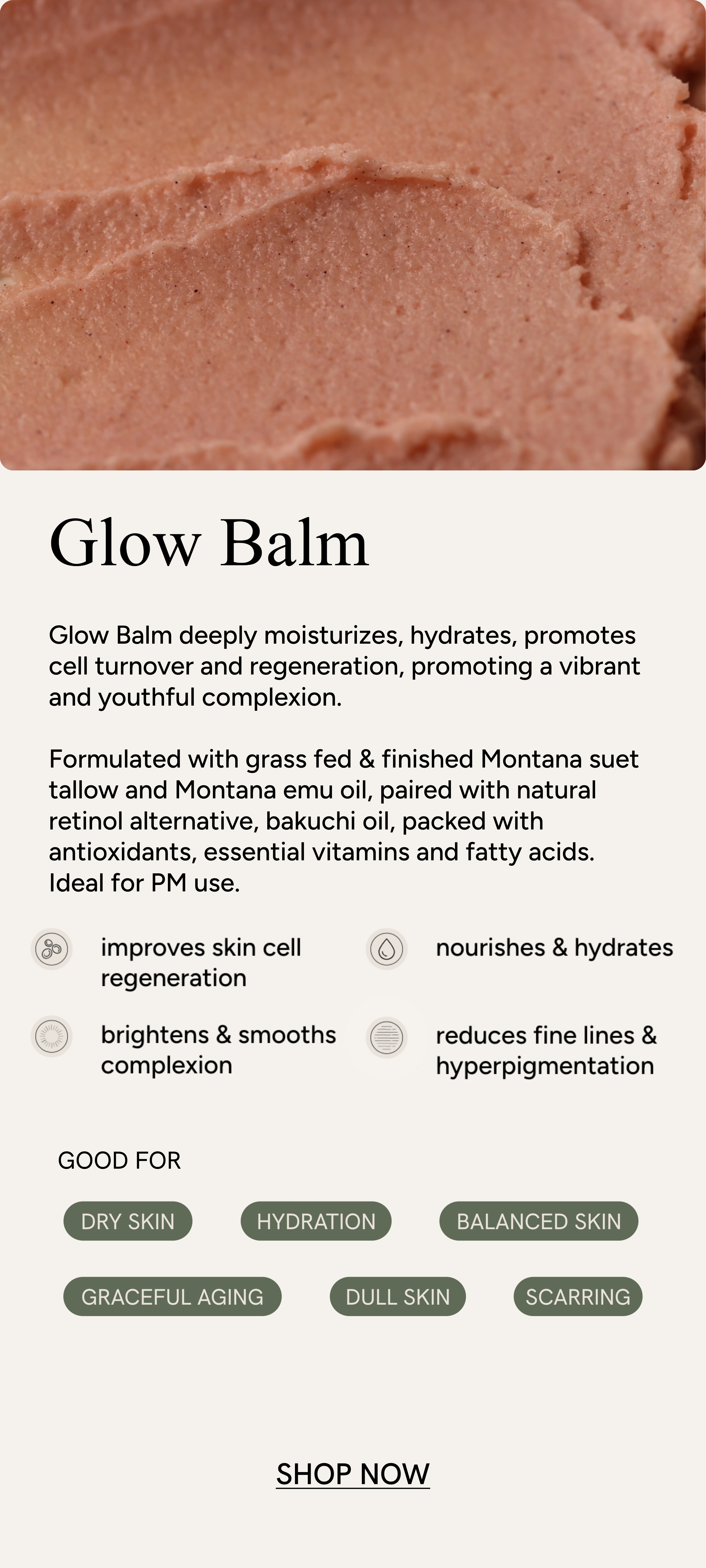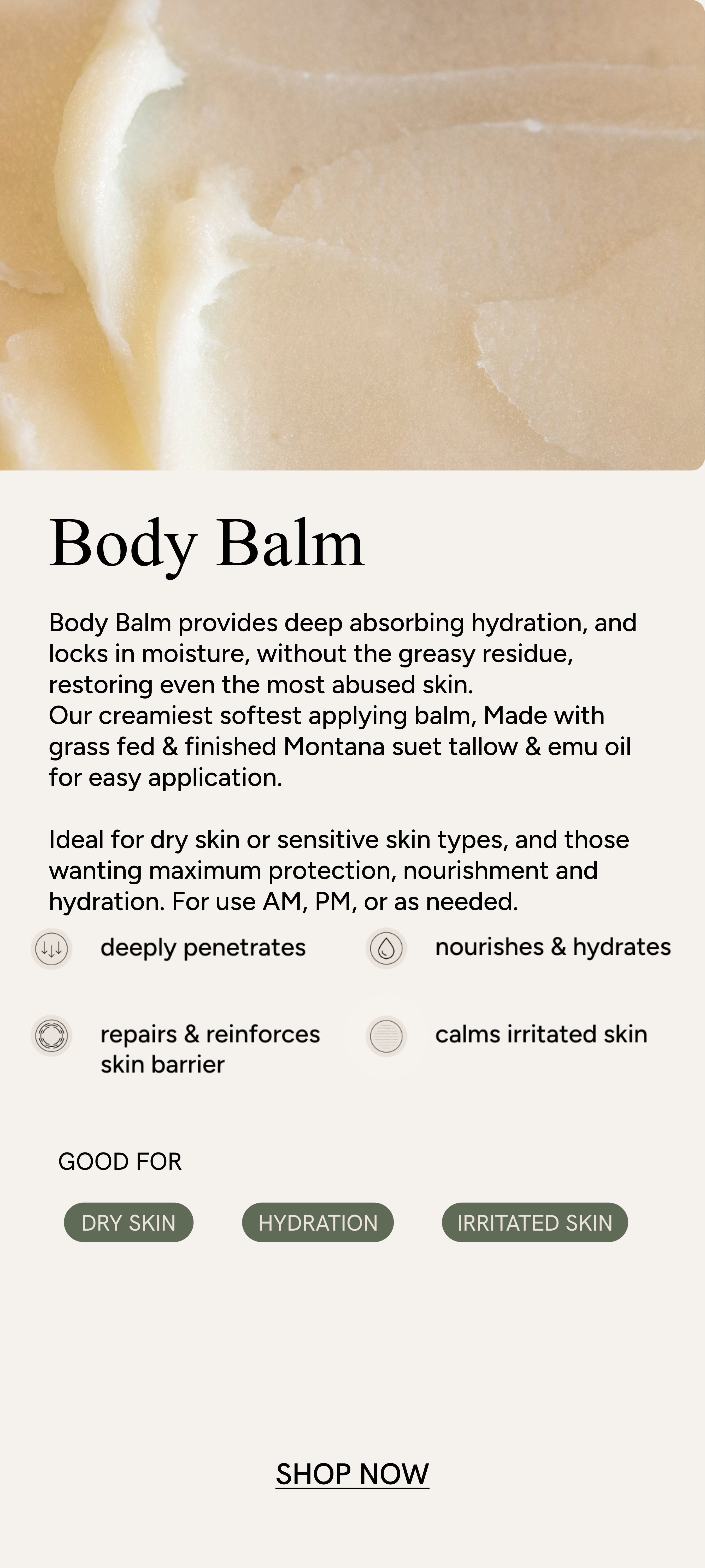 Our Base: Regeneratively raised, Grass fed & finished suet tallow from Montana cattle, chosen for it's compatibility with human skin; containing the building blocks skin can recognize and use.