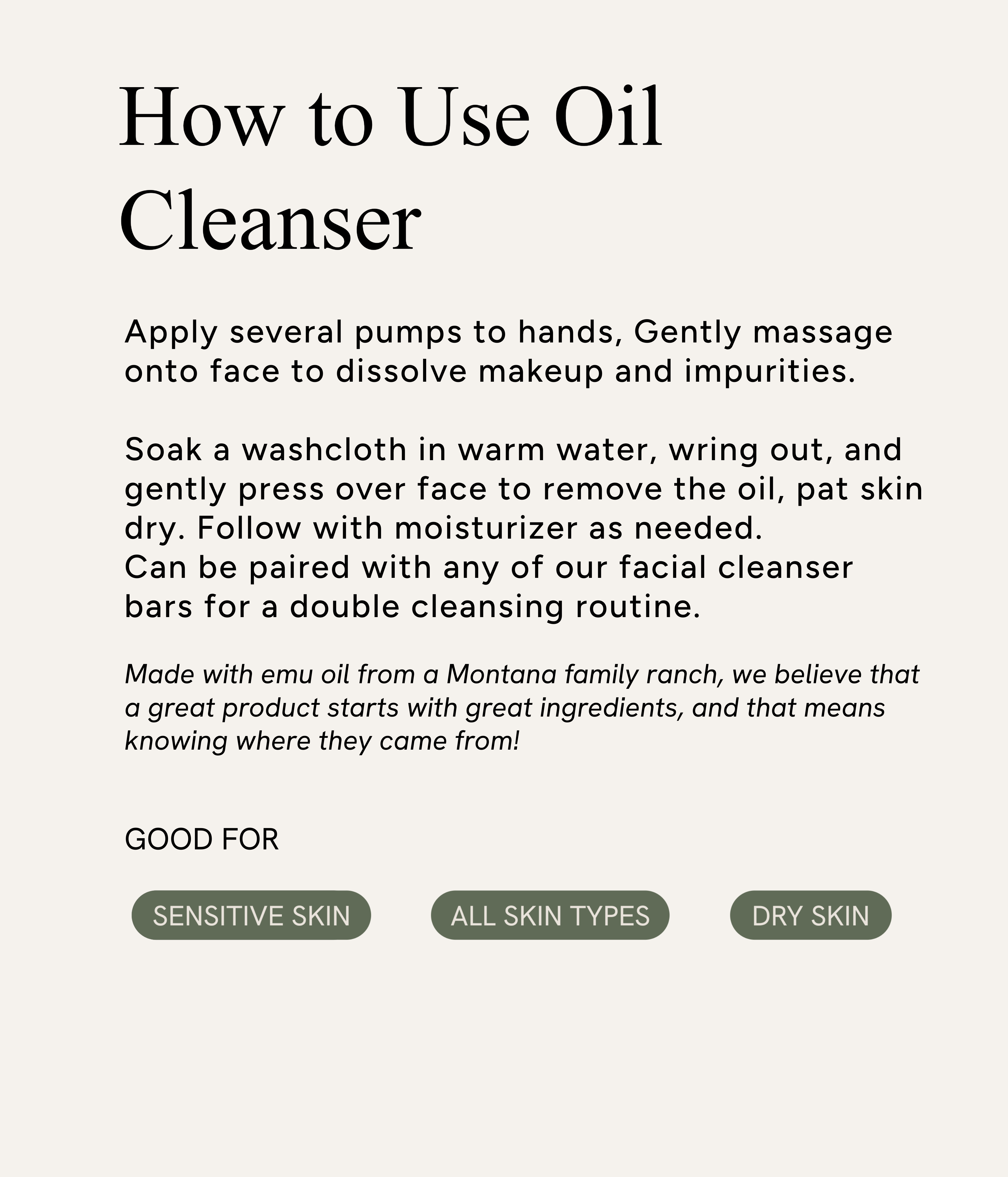 This Oil Cleanser effectively dissolves dirt, excess oil, make up and impurities without stripping moisture. Our lightweight, nourishing formula rinses clean, leaving skin soft, balanced, and refreshed.